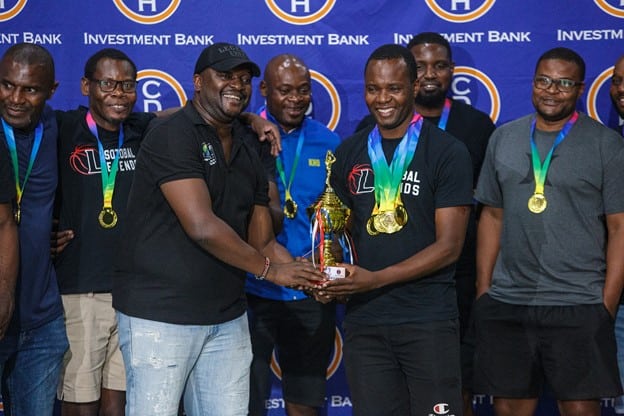 Pictured: Brave Hearts men celebrate receiving the champion’s trophy for the CDHIB ‘Money in the Bank’ basketball tournament from CDH Investment Bank’s Acting Chief Business Development Officer, Mr Jamal Kamoto