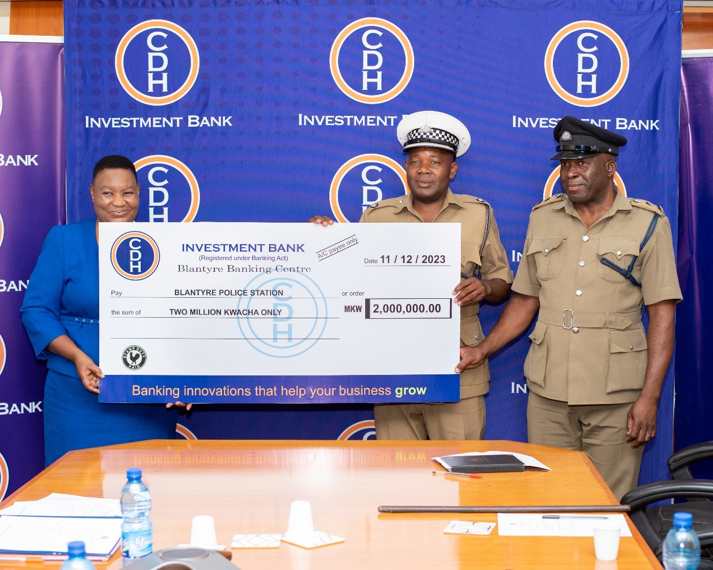 Presenting the cheque in Blantyre, Ms Ivy Kwatiwani, CDH Investment Bank, Chief Human Capital and Development Officer, said CDH Investment Bank decided to support the Blantyre Police Station as the bank appreciates the role the station delivers in providing safety and security for individuals and businesses in the country.